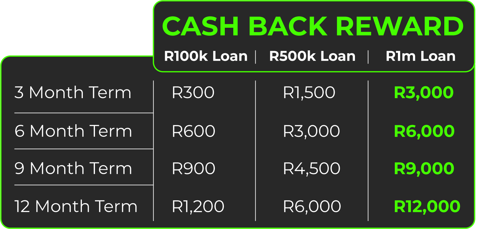 Click & Borrow® from us and get rewarded with a cash back of R100 or more per month for every R100,000 loaned*
